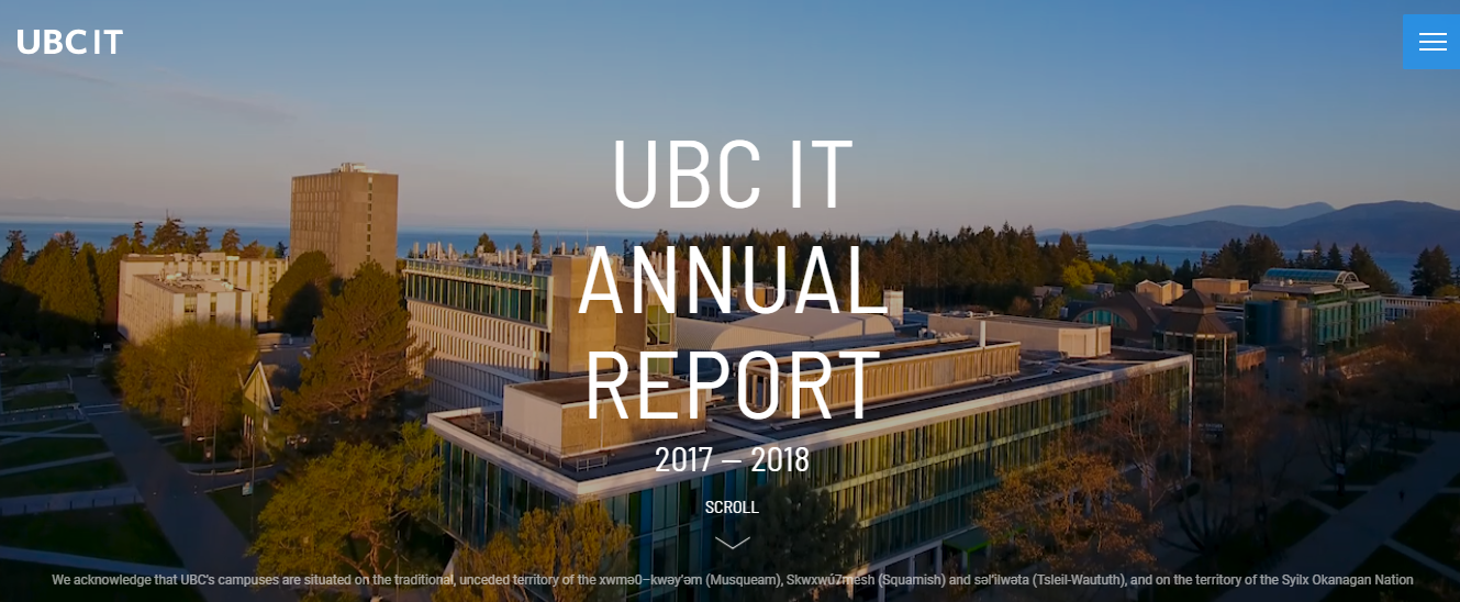 UBC IT's 2017/18 Annual Report is now available! The report highlights our activities in support of the UBC community and working in collaboration with our partners across the University on both the Vancouver and Okanagan campuses. Our stories are themed around how technology impacts students, faculty, staff, and researchers at UBC, specifically how we're: