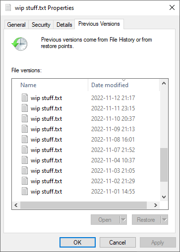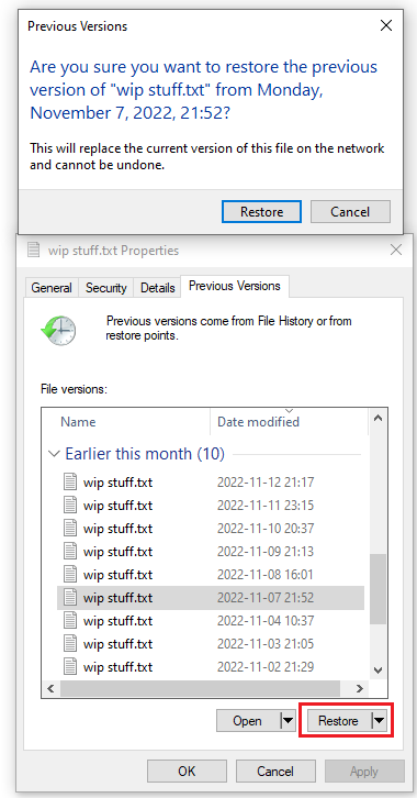 - To overwrite the current copy of the file with the previous saved one, select the version you want to return to and click Restore