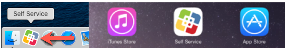 Your device will need to be enrolled to Jamf Pro to start. To confirm, look for the Self Service application, which is automatically installed when your device is enrolled. On macOS, Self Service is located in the Applications folder or on the Dock. On iOS, the app is located on the home screen. See below for examples:
