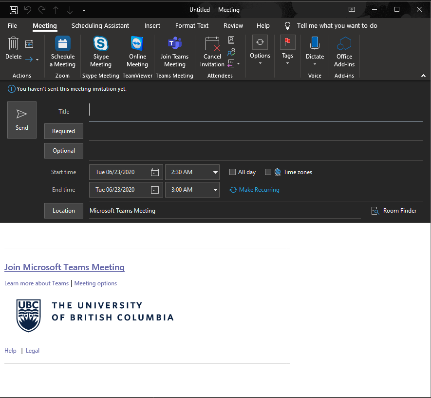 - Add your invitees in the To or Required field as if you are scheduling regular meetings.