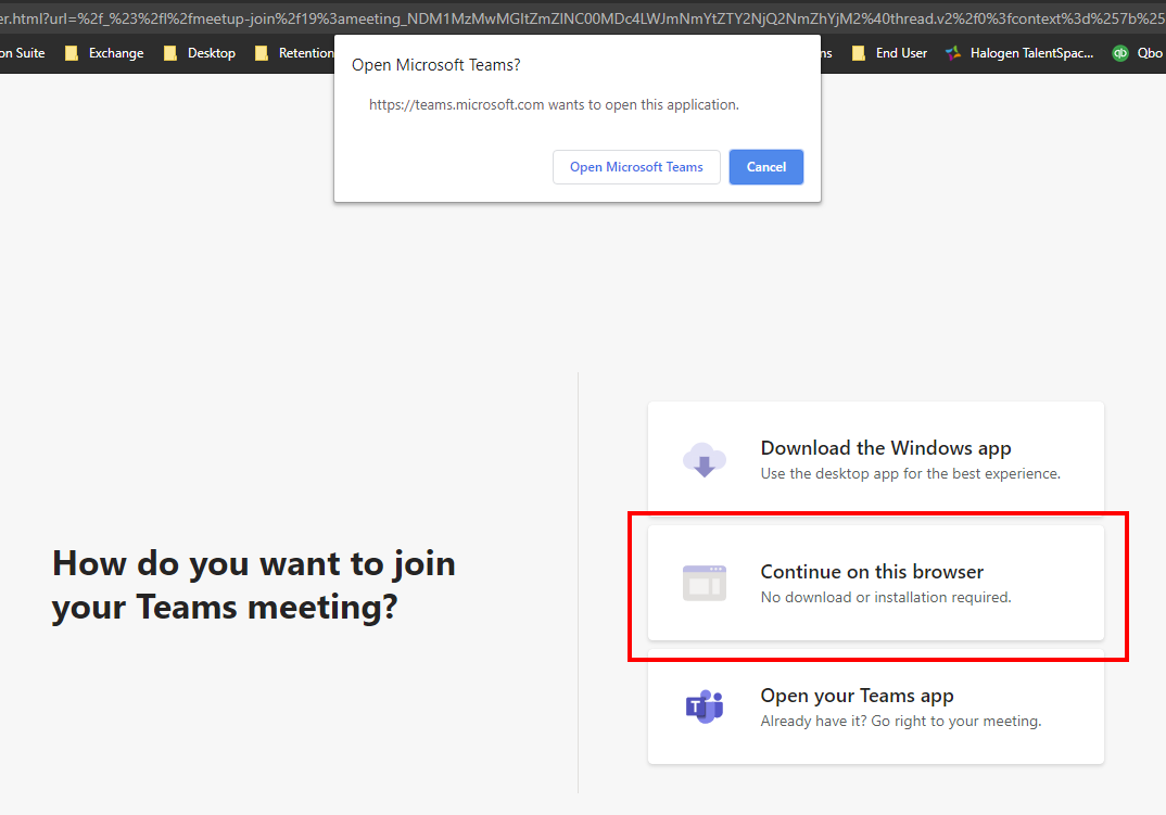 As a guest user (external users) and will enter the meeting via Teams Web App by clicking on Continue on this browser.