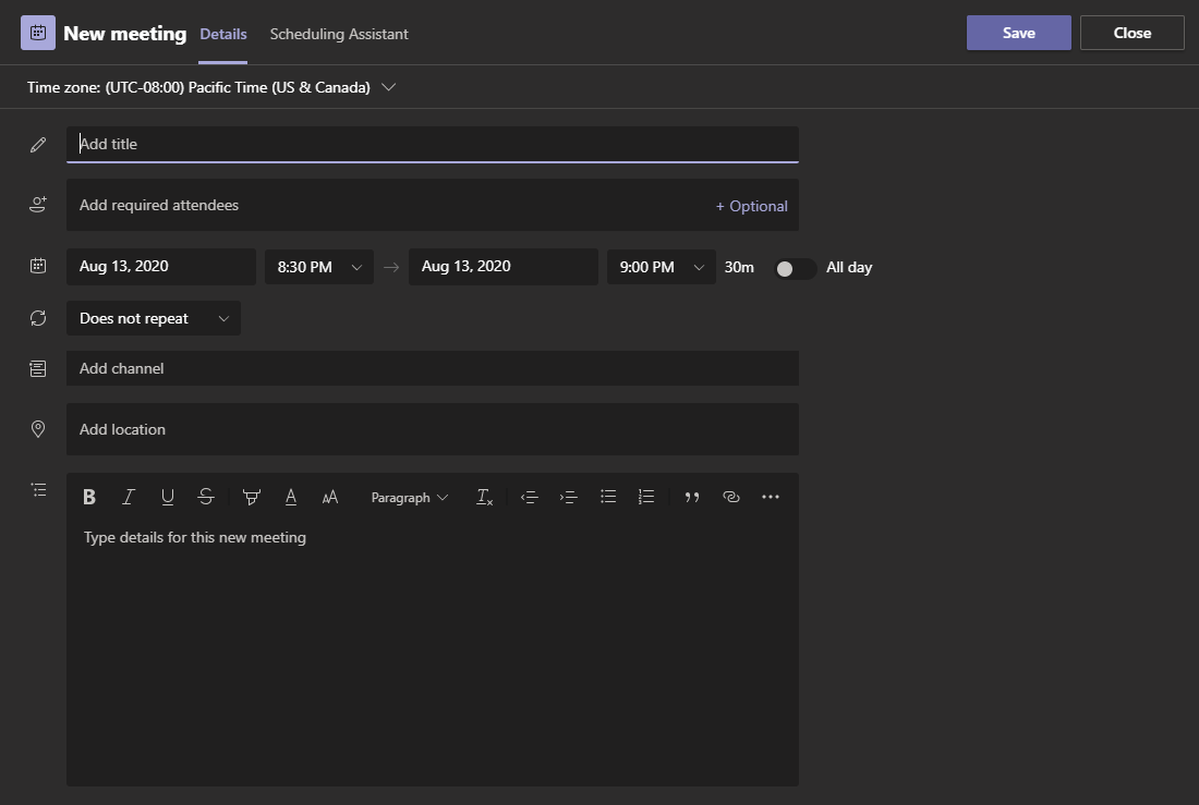 on the top right corner. - Enter in the time and date of your meeting and who you wish to invite. When you are finished with the meeting invite details, you may click Save.