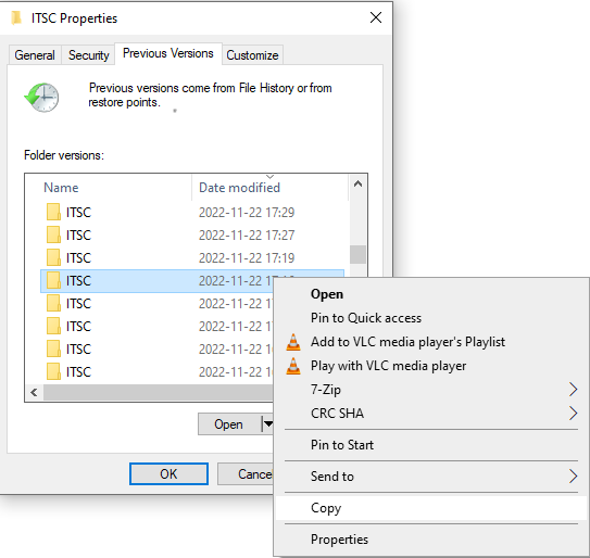 - To copy the older version of the folder to another spot, right click on the folder then select Copy